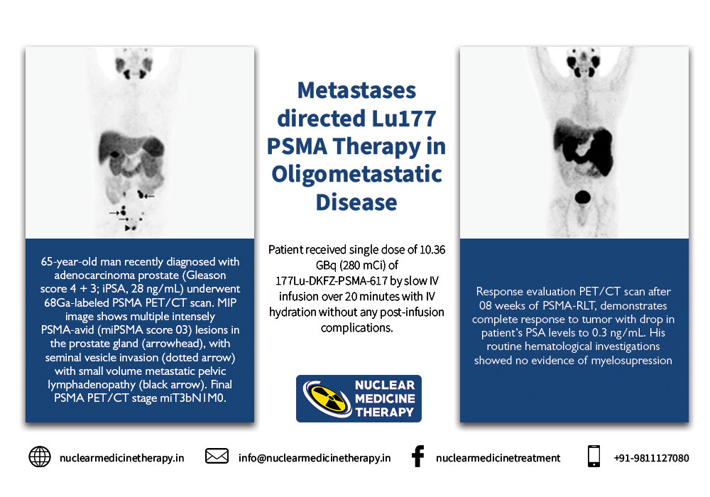 Metastasis-directed Lu-177 PSMA therapy is a novel and effective treatment for oligometastatic prostate cancer (OMPC), which involves five or fewer metastatic sites. OMPC is a transitional state between localized and widespread metastatic prostate cancer, often diagnosed through advanced imaging techniques like PSMA PET-CT. This state is characterized by more indolent tumor biology, making it suitable for targeted focal ablative therapy.