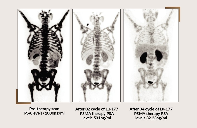 The patient received 1st dose of 177Lu DKFZ-PSMA-617 by slow intravenous infusion using renal protection protocol (Hydration with intravenous normal saline). And after 3 months, he received the 2nd dose of 177Lu DKFZ-PSMA-617. He is also on Enzalutamide daily under the guidance of the medical oncologist.